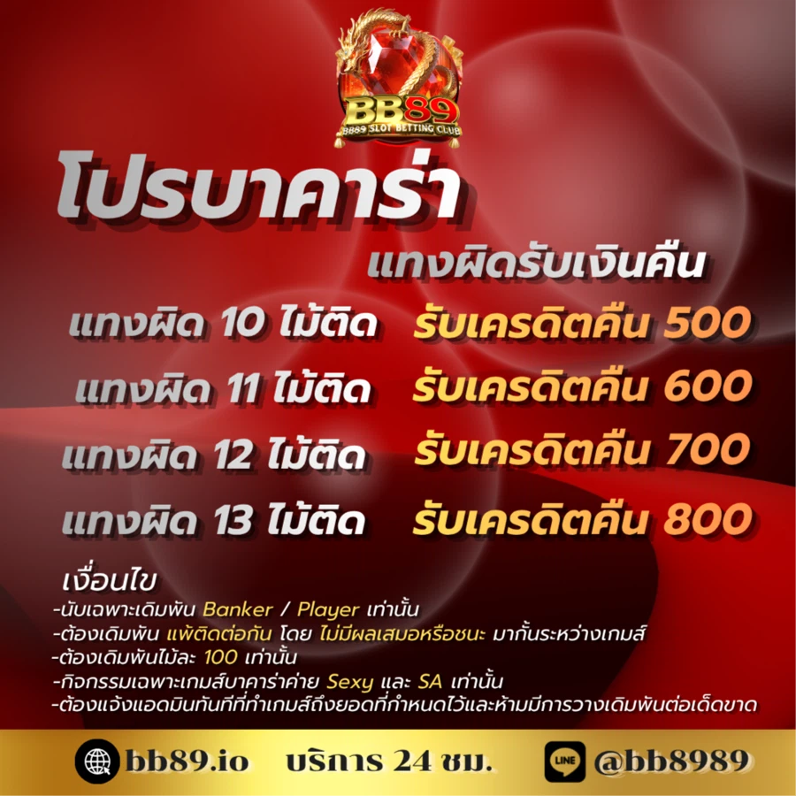 สำหรับผู้ที่ชื่นชอบการเล่นเกมคาสิโนสด BB89 ก็มีโบนัสพิเศษที่คุณไม่ควรพลาด เช่น โบนัสเพิ่มเติมเมื่อเล่นเกมคาสิโนสดเป็นเวลานาน หรือโปรโมชั่นที่เกี่ยวข้องกับเกมไพ่ยอดนิยมอย่างบาคาร่าและแบล็คแจ็ค ซึ่งช่วยเพิ่มโอกาสในการชนะและทำให้การเล่นเกมของคุณสนุกยิ่งขึ้น
